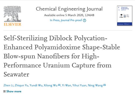 她不仅学习成绩优秀,也在科研创新方面,勤奋努力,坚持不懈,放弃寒暑假休息时间,积极参与科研项目。在南海海洋资源与利用国家重点实验室学习期间掌握了氨基酸类聚合物、MOF材料、制备纳米纤维材料的新方法--溶液喷射纺丝的合成技术,掌握材料常用FTIR、NMR、GPC、SEM、 EDS、XRD、XPS、BET、DLS、ICP-MS、酶标仪等表征方法,并可独立操作仪器,熟练使用Origin、Chembiodraw、MestReNova、ImageJ、XPSPEAK等软件,累计阅读英文文献百余篇,具备一定的科研能力,且以第一作者在Chemical Engineering Journal(Q1 IF8.36)上发表学术论文《Self-sterilizing diblock polycation-enhanced polyamidoxime shape-stable blow-spun nanofibers for high-performance uranium capture from seawater》一篇。此外,还与同学合作设计发明专利一项(一种处理海上石油污染物的新方法/公开号CN108640220A),实用新型专利两项(一种新型旋转电磁充电装置/专利号201920314390.8/一种新型的双动榨汁机专利号: 201920314761.2)。积极发展自己的兴趣爱好,参加课外实践课程,2018年7月参加由北京大学考古文博公司、北京大学陶瓷考古与艺术研究所主办的«历代青花画法研究»实验考古暑期课程,以第二作者在《人类文化遗产保护》上发表论文一篇。现已被推免到长春应化所攻读硕士研究生。